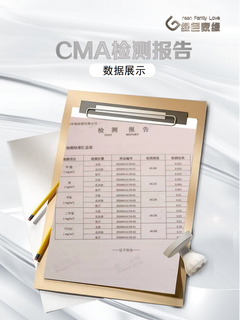 治理工程完成后,经过规定的充分通风与反应周期,项目进入最终效果验证阶段。绿色家缘始终坚持“效果可视、数据说话”的原则,积极推行第三方权威检测验收模式。在本案例中,由具备中国计量认证(CMA)资质的独立第三方检测机构,依据《室内空气质量标准》(GB/T 18883-2022),在标准规定的检测条件下(关闭门窗12小时)对室内关键点位进行空气采样与实验室分析。